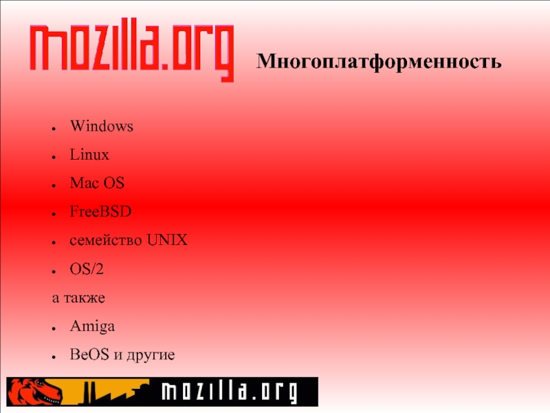 Слайд 11Многоплатформенность Windows Linux Mac OS FreeBSD семейство UNIX OS/2 а также Amiga BeOS