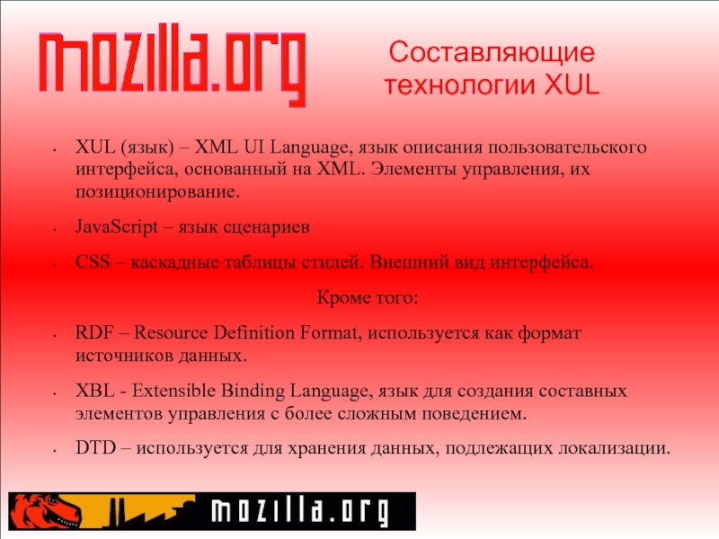 интерфейса, основанный на XML. Элементы управления, их позиционирование. JavaScript – язык сценариев CSS – каскадные таблицы стилей. Внешний вид интерфейса. Кроме того: RDF – Resource Definition Format, используется как формат источников данных. XBL - Extensible Binding Language, язык для создания составных элементов управления с более сложным поведением. DTD – используется для хранения данных, подлежащих локализации.