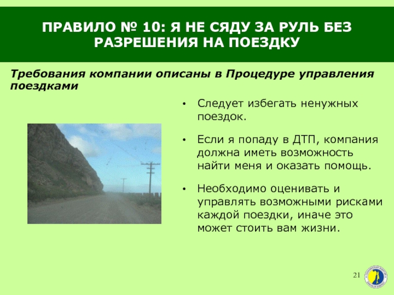 Я должен управлять автомобилем, соблюдая правила безопасности, во время деловых поездок.