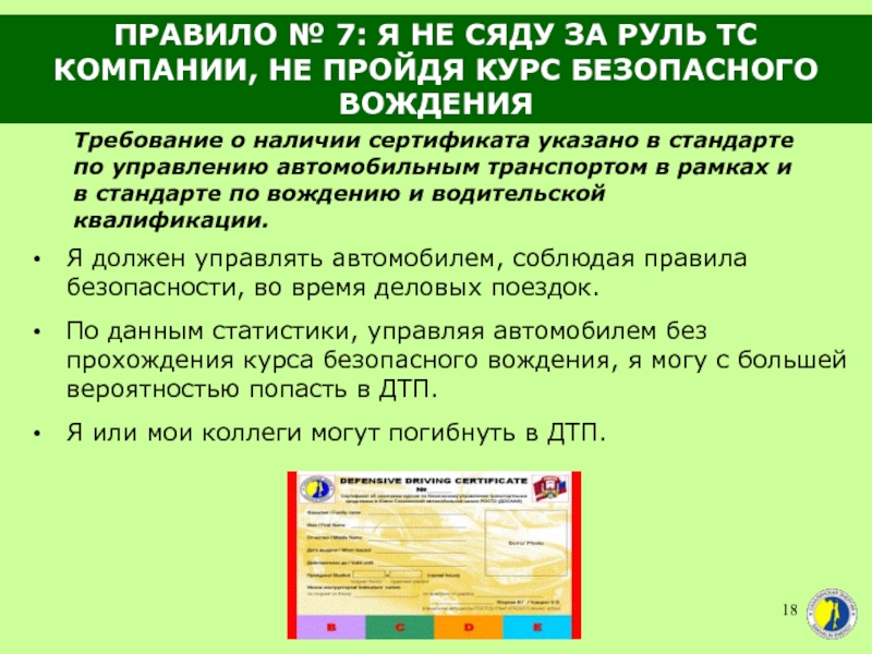 Требование о наличии сертификата указано в стандарте по управлению автомобильным транспортом в рамках и в стандарте по вождению и водительской квалификации.