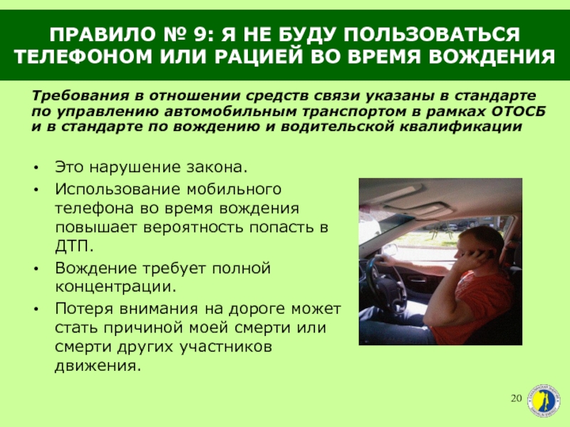 Требования в отношении средств связи указаны в стандарте по управлению автомобильным транспортом в рамках ОТОСБ и в стандарте по вождению и водительской квалификации