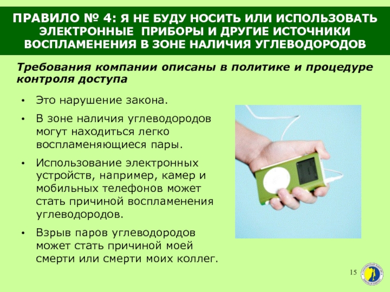 Использование электронных устройств, например, камер и мобильных телефонов может стать причиной воспламенения углеводородов.