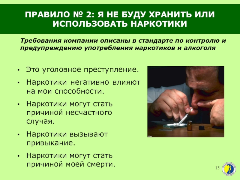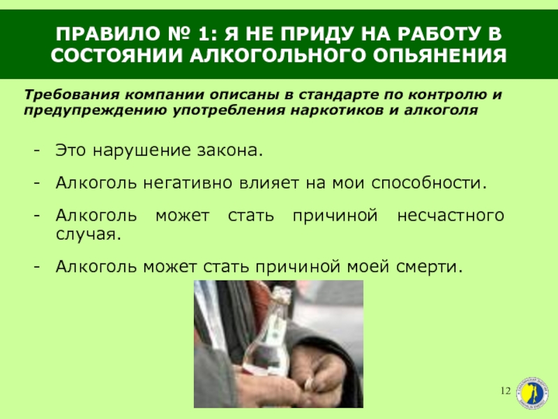 Требования компании описаны в стандарте по контролю и предупреждению употребления наркотиков и алкоголя