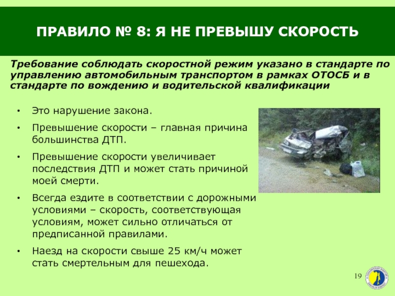 Превышение скорости увеличивает последствия ДТП и может стать причиной моей смерти.