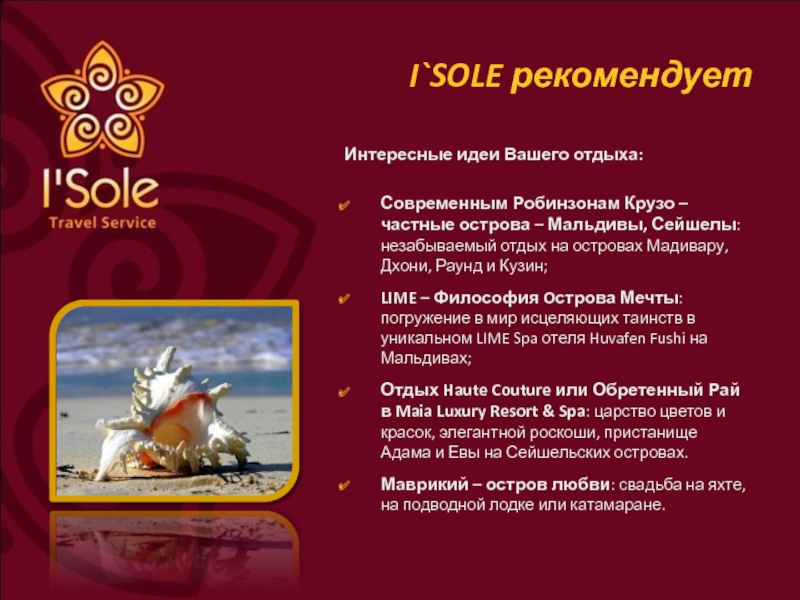 эксклюзивных туров на тропические острова (I`SOLE – в переводе с итальянского «Острова»).