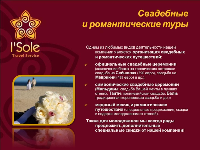 символические свадебные церемонии (Мальдивы: свадьба Вашей мечты в лучших отелях, Таити: полинезийская свадьба, Бали: традиционная королевская свадьба и др.);