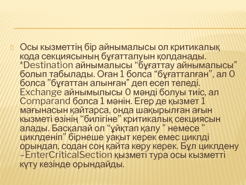 айнымалысы “бұғаттау айнымалысы” болып табылады. Оған 1 болса “бұғатталған”, ал 0 болса ”бұғаттан алынған” деп есеп теледі. Exchange айнымылысы 0 мәнді болуы тиіс, ал Comparand болса 1 мәнін. Егер де қызмет 1 мағынасын қайтарса, онда шақырылған ағын кызметі өзінің “билігіне” критикалық секциясын алады. Басқалай ол “ұйқтап қалу ” немесе ”циклденіп” бірнеше уақыт керек емес циклді орындап, содан соң қайта көру керек. Бұл циклдену –EnterCriticalSection қызметі тура осы кызметті күту кезінде орындайды.