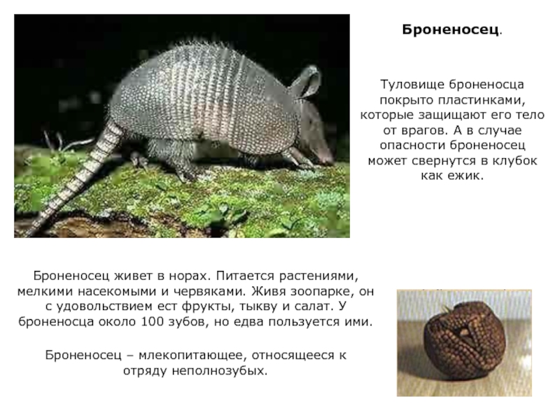 Броненосец – млекопитающее, относящееся к отряду неполнозубых.