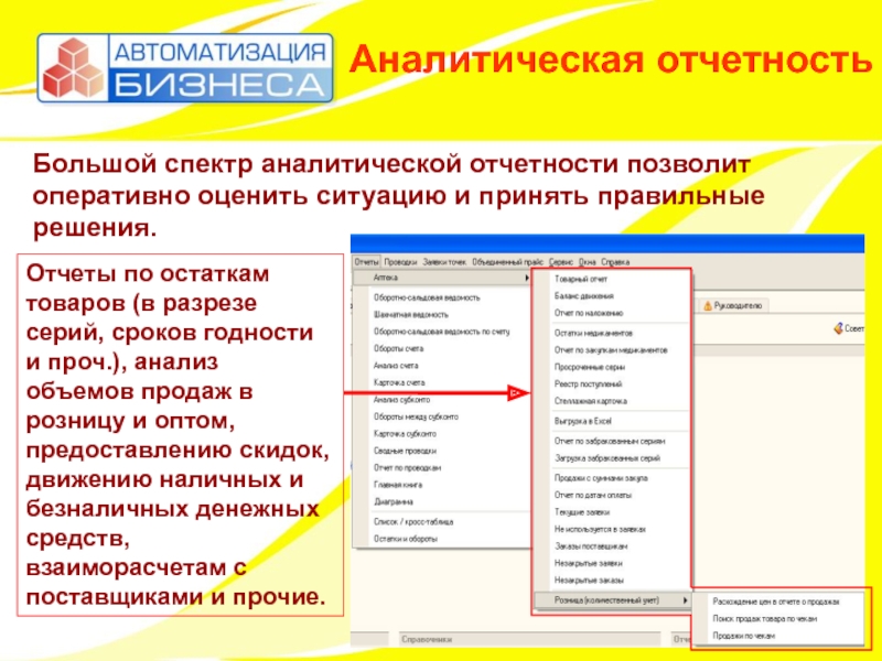 Большой спектр аналитической отчетности позволит оперативно оценить ситуацию и принять правильные решения.