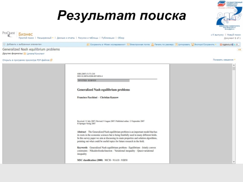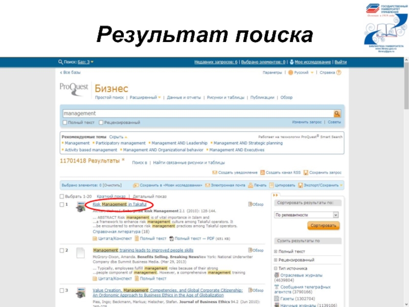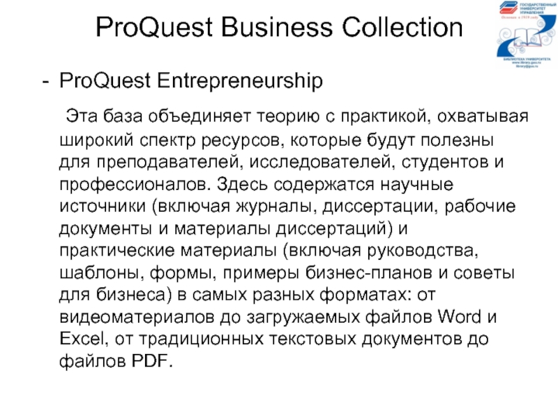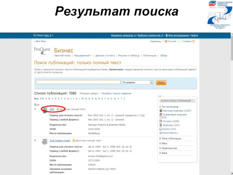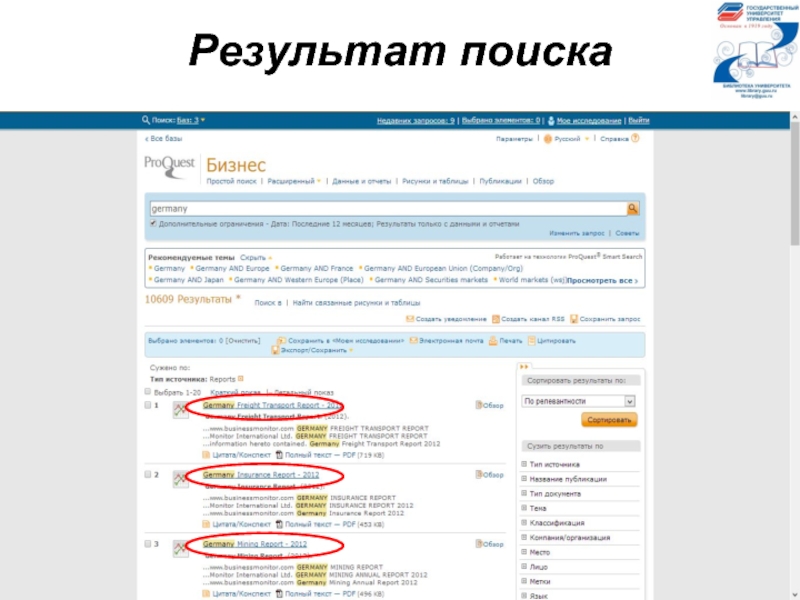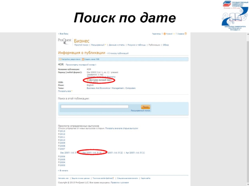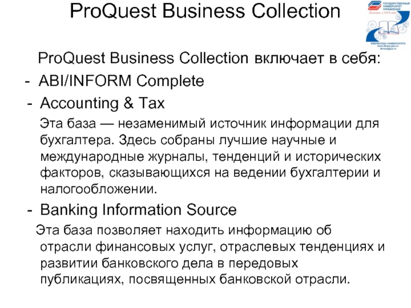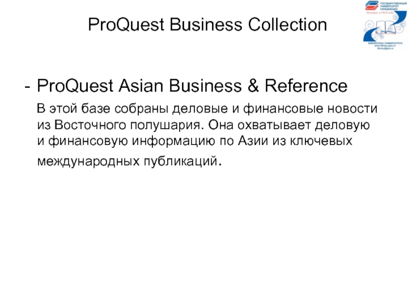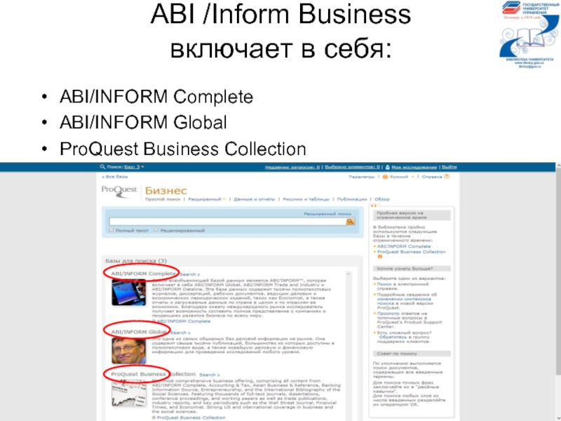 на рынке. Она содержит свыше тысячи публикаций, большинство из которых доступны в полнотекстовом виде, а также новейшую деловую и финансовую информацию для проведения исследований любого уровня.