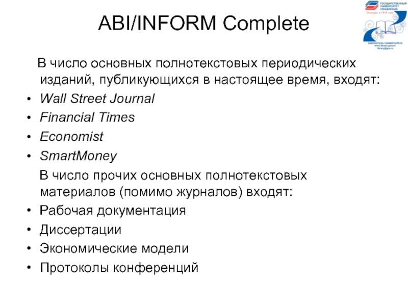 Это одна из самых обширных баз деловой информации на рынке. Она содержит свыше тысячи публикаций, большинство из которых доступны в полнотекстовом виде, а также новейшую деловую и финансовую информацию для проведения исследований любого уровня.