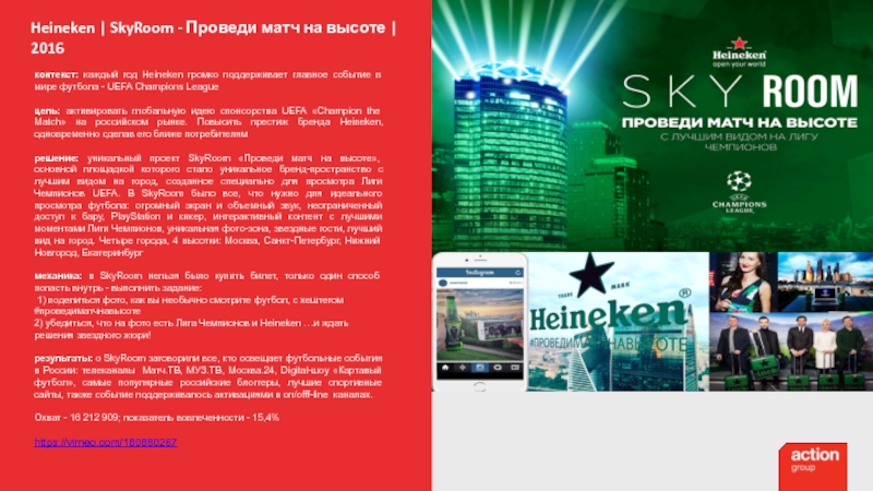 решение: уникальный проект SkyRoom «Проведи матч на высоте», основной площадкой которого стало уникальное бренд-пространство с лучшим видом на город, созданное специально для просмотра Лиги Чемпионов UEFA. В SkyRoom было все, что нужно для идеального просмотра футбола: огромный экран и объемный звук, неограниченный доступ к бару, PlayStation и кикер, интерактивный контент с лучшими моментами Лиги Чемпионов, уникальная фото-зона, звездные гости, лучший вид на город. Четыре города, 4 высотки: Москва, Санкт-Петербург, Нижний Новгород, Екатеринбург