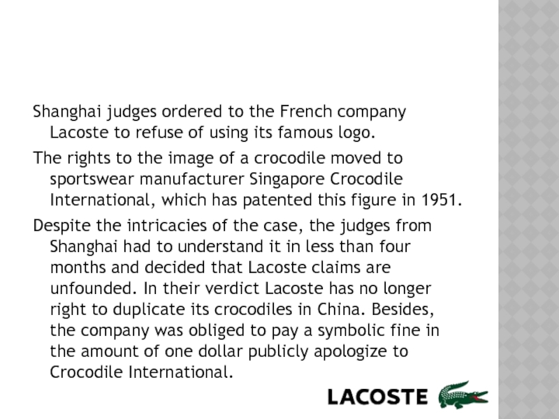Despite the intricacies of the case, the judges from Shanghai had to understand it in less than four months and decided that Lacoste claims are unfounded. In their verdict Lacoste has no longer right to duplicate its crocodiles in China. Besides, the company was obliged to pay a symbolic fine in the amount of one dollar publicly apologize to Crocodile International.