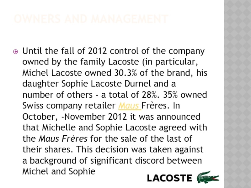 owned by the family Lacoste (in particular, Michel Lacoste owned 30.3% of the brand, his daughter Sophie Lacoste Durnel and a number of others - a total of 28%. 35% owned Swiss company retailer Maus Frères. In October, -November 2012 it was announced that Michelle and Sophie Lacoste agreed with the Maus Frères for the sale of the last of their shares. This decision was taken against a background of significant discord between Michel and Sophie