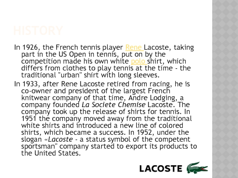 In 1933, after Rene Lacoste retired from racing, he is co-owner and president of the largest French knitwear company of that time, Andre Lodging, a company founded La Societe Chemise Lacoste. The company took up the release of shirts for tennis. In 1951 the company moved away from the traditional white shirts and introduced a new line of colored shirts, which became a success. In 1952, under the slogan «Lacoste - a status symbol of the competent sportsman" company started to export its products to the United States.