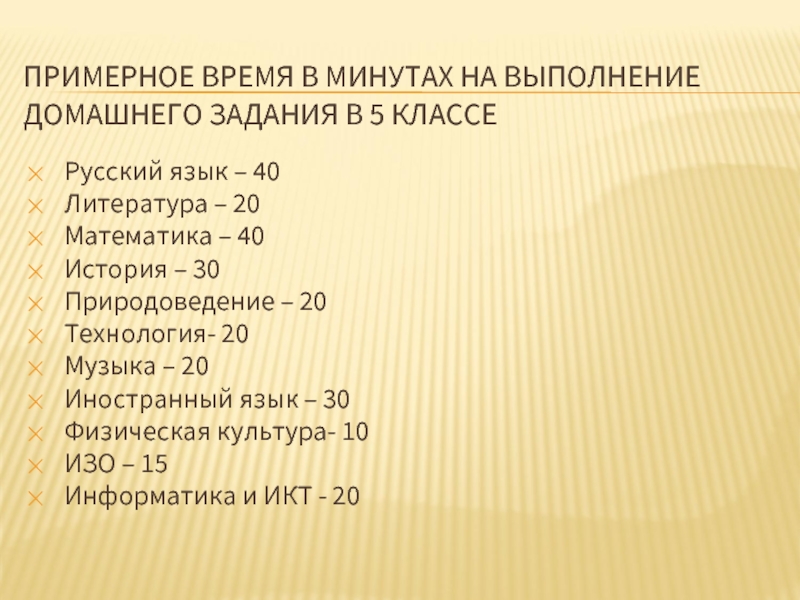 Слайд 35ПРИМЕРНОЕ ВРЕМЯ В МИНУТАХ НА ВЫПОЛНЕНИЕ ДОМАШНЕГО ЗАДАНИЯ В 5 КЛАССЕ