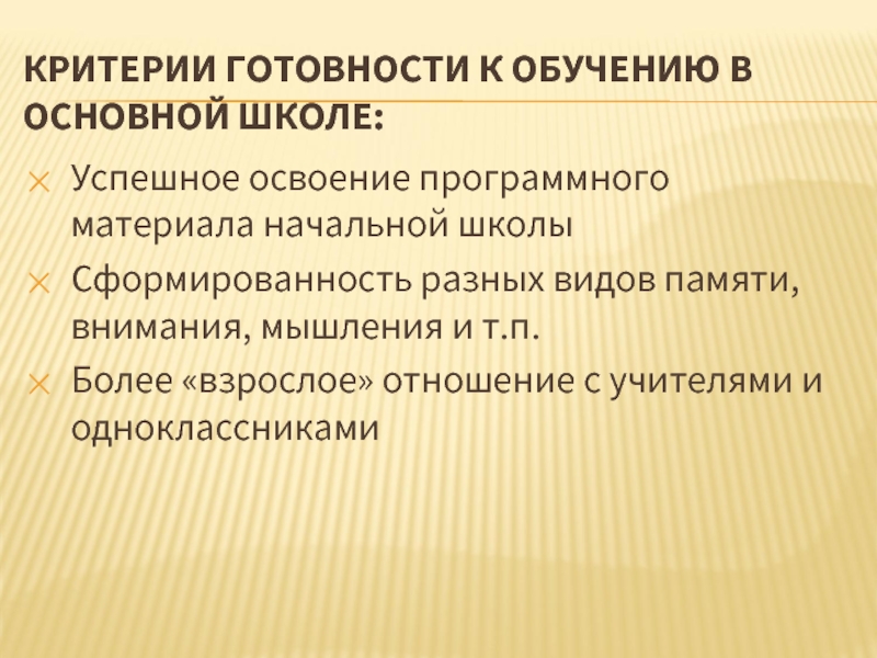 Слайд 3КРИТЕРИИ ГОТОВНОСТИ К ОБУЧЕНИЮ В ОСНОВНОЙ ШКОЛЕ: