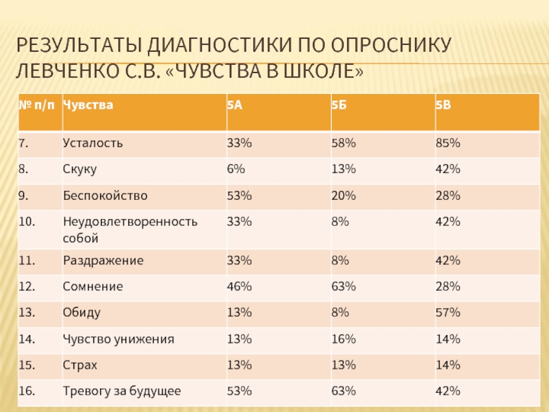 Слайд 14РЕЗУЛЬТАТЫ ДИАГНОСТИКИ ПО ОПРОСНИКУ ЛЕВЧЕНКО С.В. «ЧУВСТВА В ШКОЛЕ»