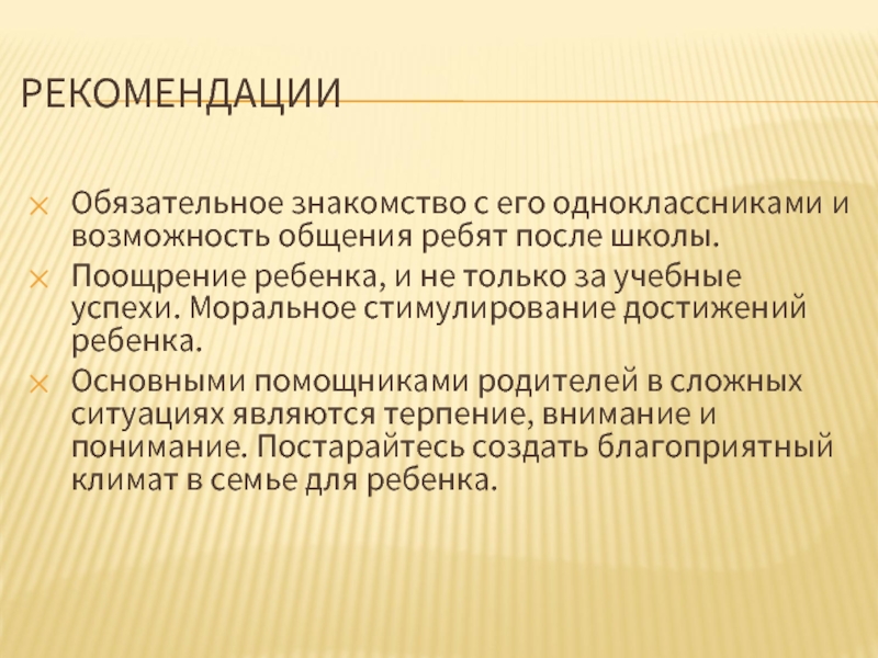 Основными помощниками родителей в сложных ситуациях являются терпение, внимание и понимание. Постарайтесь создать благоприятный климат в семье для ребенка.