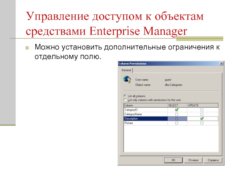 Слайд 12Управление доступом к объектам средствами Enterprise Manager