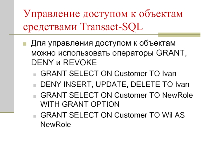 Слайд 14Управление доступом к объектам средствами Transact-SQL