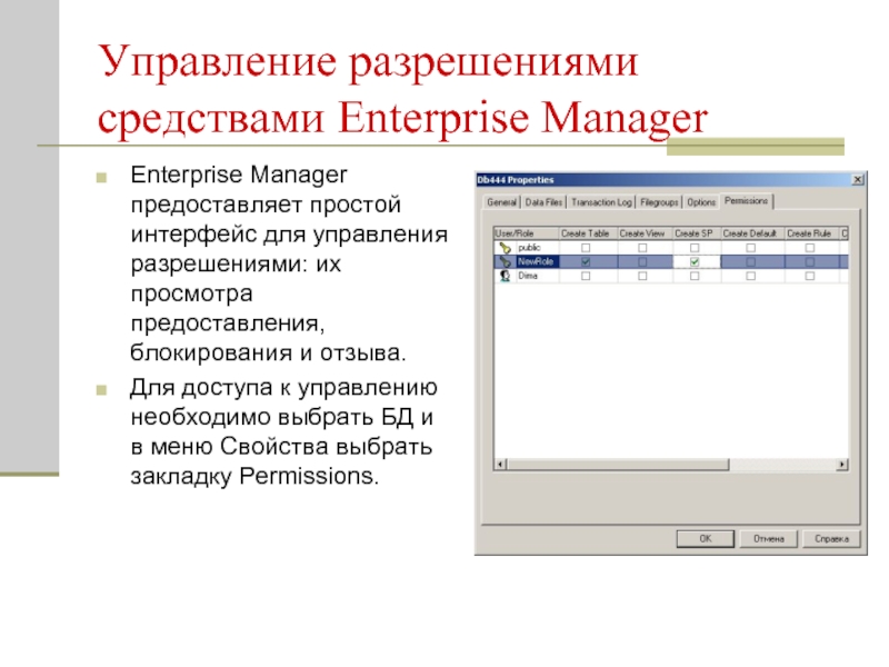 Слайд 8Управление разрешениями средствами Enterprise Manager