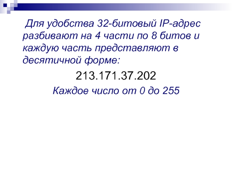 Слайд 3 Для удобства 32-битовый IP-адрес разбивают на 4 части по 8 битов