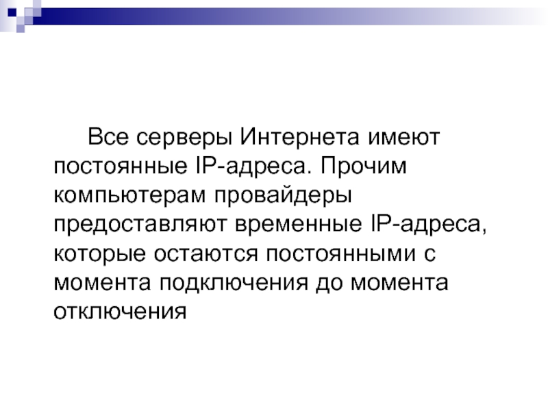 Слайд 4 Все серверы Интернета имеют постоянные IP-адреса. Прочим компьютерам провайдеры предоставляют временные