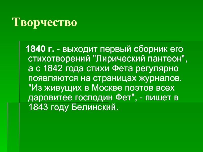 а с 1842 года стихи Фета регулярно появляются на страницах журналов. "Из живущих в Москве поэтов всех даровитее господин Фет", - пишет в 1843 году Белинский.