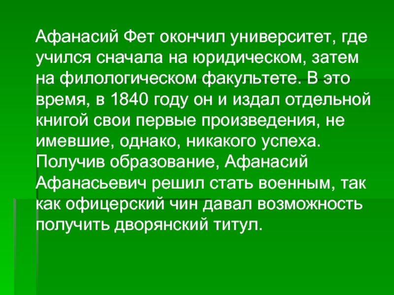 затем на филологическом факультете. В это время, в 1840 году он и издал отдельной книгой свои первые произведения, не имевшие, однако, никакого успеха. Получив образование, Афанасий Афанасьевич решил стать военным, так как офицерский чин давал возможность получить дворянский титул.
