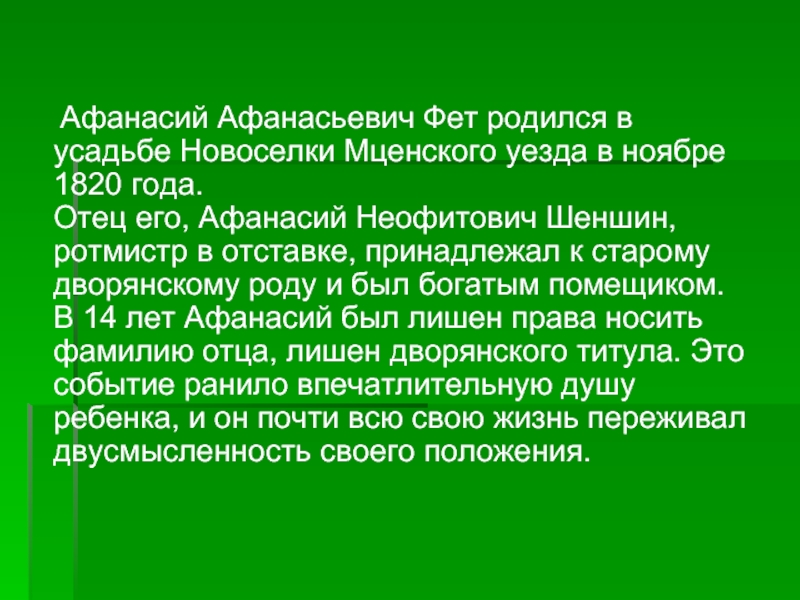 Афанасий Афанасьевич Фет родился в усадьбе Новоселки Мценского