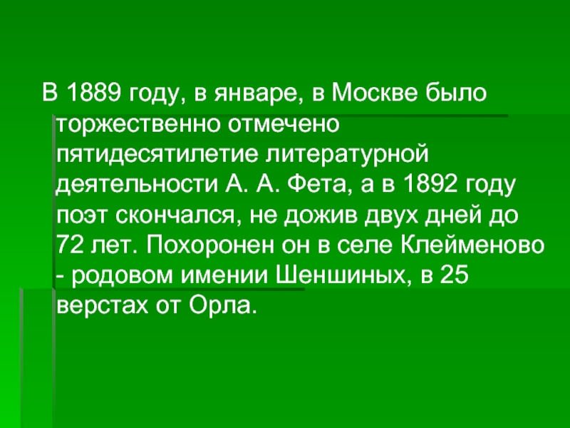 отмечено пятидесятилетие литературной деятельности А. А. Фета, а в 1892 году поэт скончался, не дожив двух дней до 72 лет. Похоронен он в селе Клейменово - родовом имении Шеншиных, в 25 верстах от Орла.