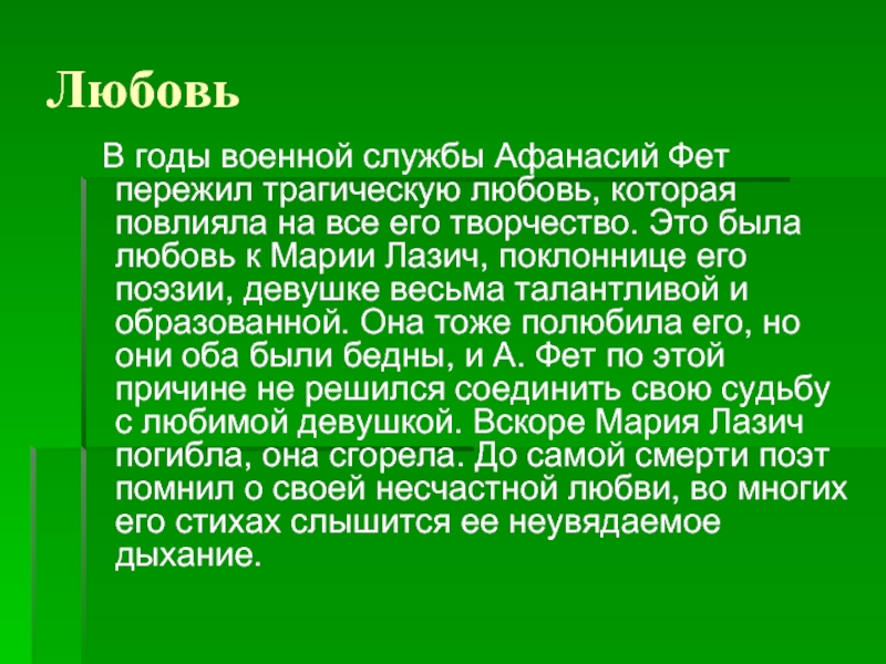 которая повлияла на все его творчество. Это была любовь к Марии Лазич, поклоннице его поэзии, девушке весьма талантливой и образованной. Она тоже полюбила его, но они оба были бедны, и А. Фет по этой причине не решился соединить свою судьбу с любимой девушкой. Вскоре Мария Лазич погибла, она сгорела. До самой смерти поэт помнил о своей несчастной любви, во многих его стихах слышится ее неувядаемое дыхание.