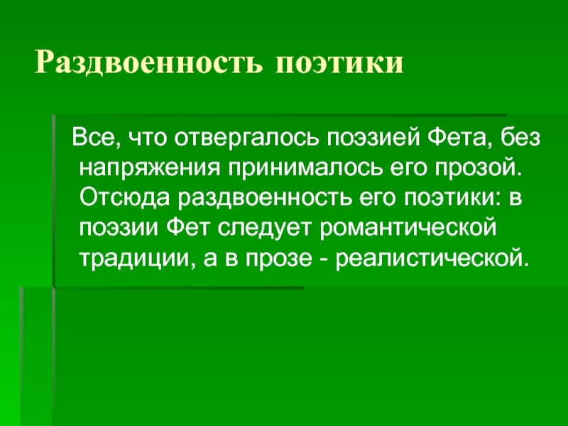 прозой. Отсюда раздвоенность его поэтики: в поэзии Фет следует романтической традиции, а в прозе - реалистической.