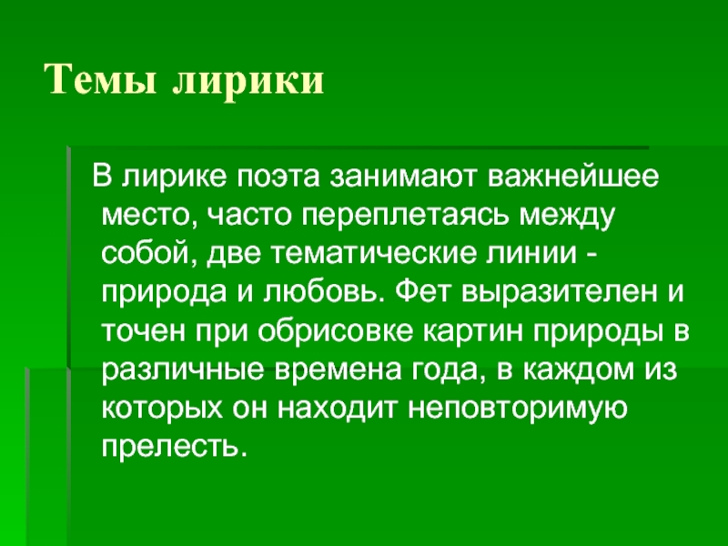 собой, две тематические линии - природа и любовь. Фет выразителен и точен при обрисовке картин природы в различные времена года, в каждом из которых он находит неповторимую прелесть.