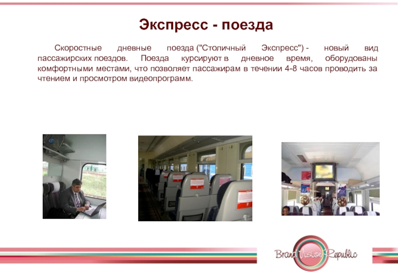 вид пассажирских поездов. Поезда курсируют в дневное время, оборудованы комфортными местами, что позволяет пассажирам в течении 4-8 часов проводить за чтением и просмотром видеопрограмм.