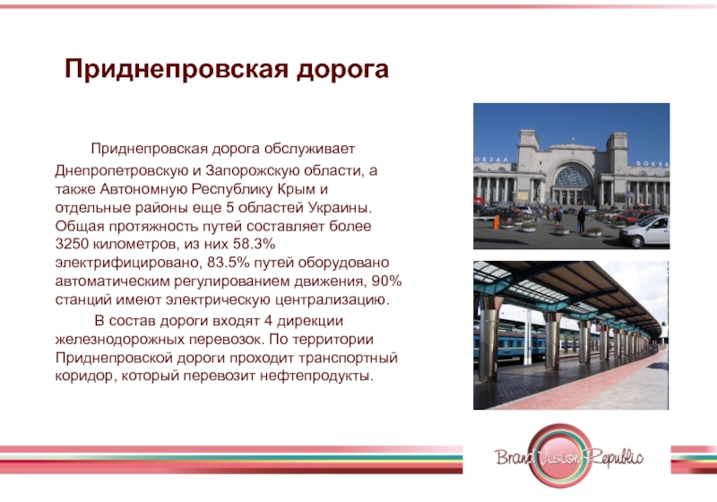 Приднепровская дорога обслуживает Днепропетровскую и Запорожскую области, а также Автономную Республику Крым и отдельные районы еще 5 областей Украины. Общая протяжность путей составляет более 3250 километров, из них 58.3% электрифицировано, 83.5% путей оборудовано автоматическим регулированием движения, 90% станций имеют электрическую централизацию.