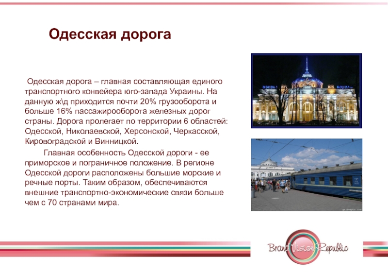 Главная особенность Одесской дороги - ее приморское и пограничное положение. В регионе Одесской дороги расположены большие морские и речные порты. Таким образом, обеспечиваются внешние транспортно-экономические связи больше чем с 70 странами мира.