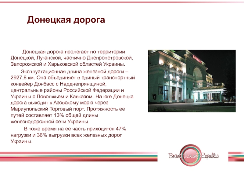 Эксплуатационная длина железной дороги – 2927,6 км. Она объединяет в единый транспортный конвейер Донбасс с Надднепрянщиной, центральные районы Российской Федерации и Украины с Поволжьем и Кавказом. На юге Донецка дорога выходит к Азовскому морю через Мариупольский Торговый порт. Протяжность ее путей составляет 13% общей длины железнодорожной сети Украины.
