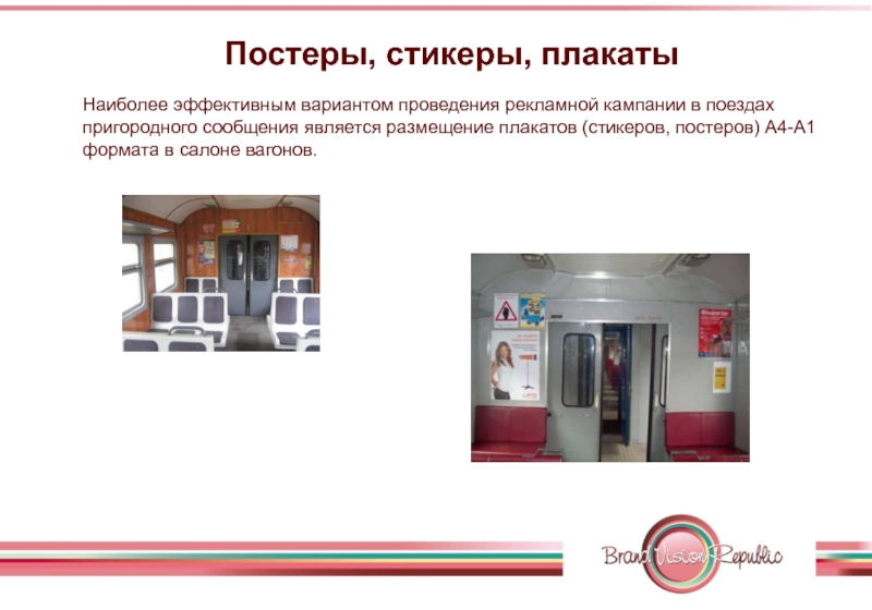 в поездах пригородного сообщения является размещение плакатов (стикеров, постеров) А4-А1 формата в салоне вагонов.