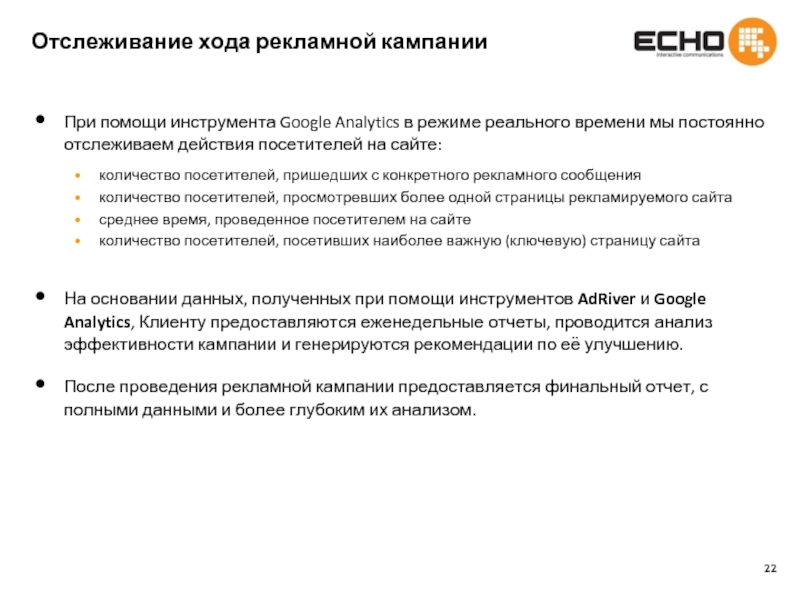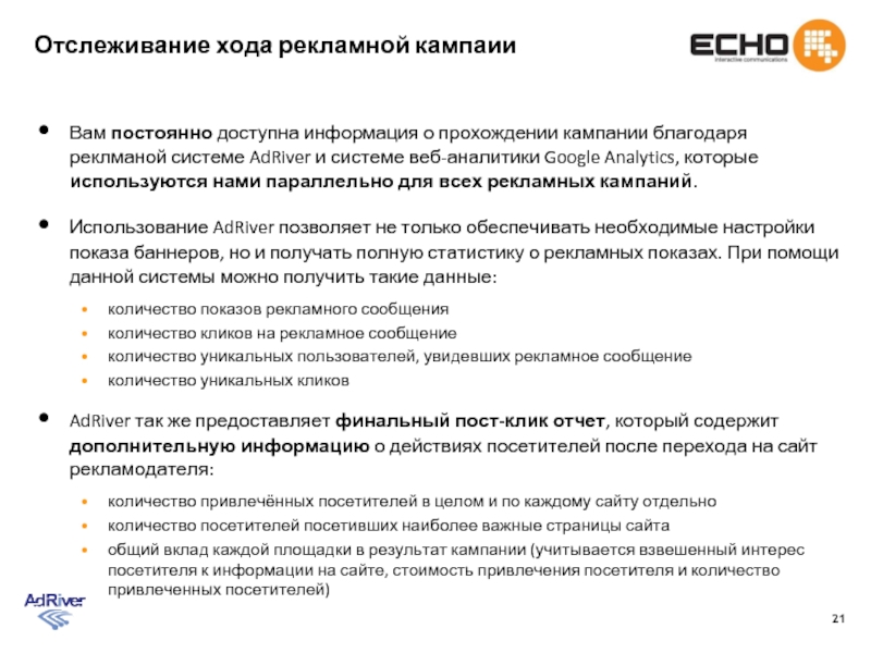 реклманой системе AdRiver и системе веб-аналитики Google Analytics, которые используются нами параллельно для всех рекламных кампаний.