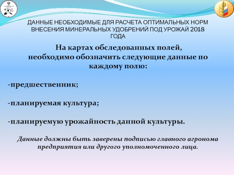 Данные должны быть заверены подписью главного агронома предприятия или другого уполномоченного лица.