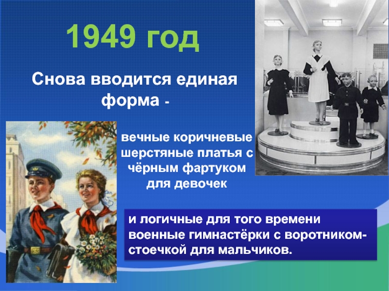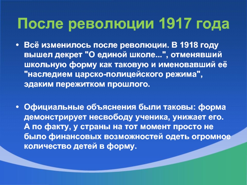 декрет "О единой школе...", отменявший школьную форму как таковую и именовавший её "наследием царско-полицейского режима", эдаким пережитком прошлого.