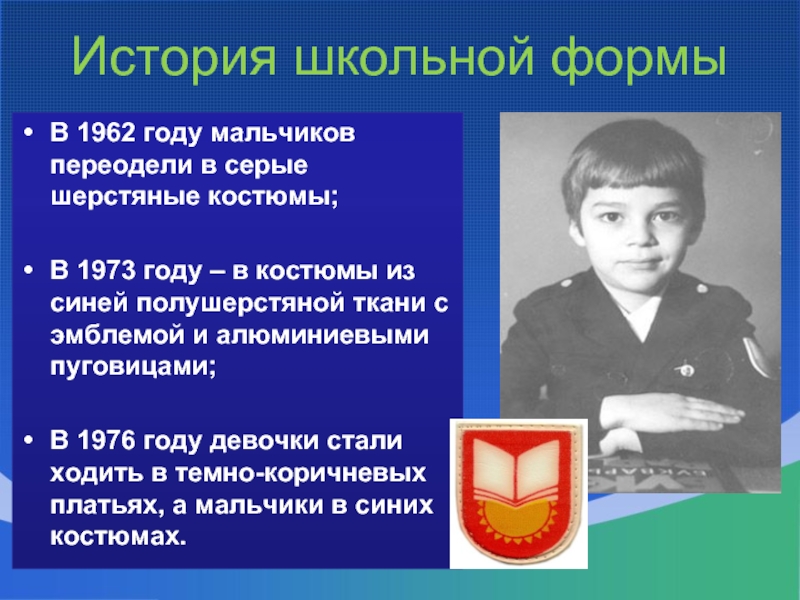 В 1962 году мальчиков переодели в серые шерстяные костюмы;