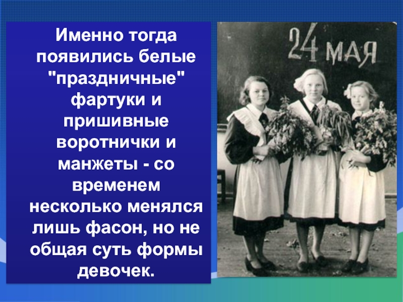 Слайд 10 Именно тогда появились белые "праздничные" фартуки и пришивные воротнички