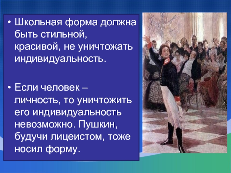 личность, то уничтожить его индивидуальность невозможно. Пушкин, будучи лицеистом, тоже носил форму.