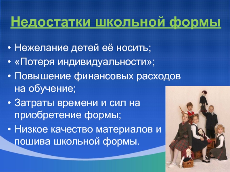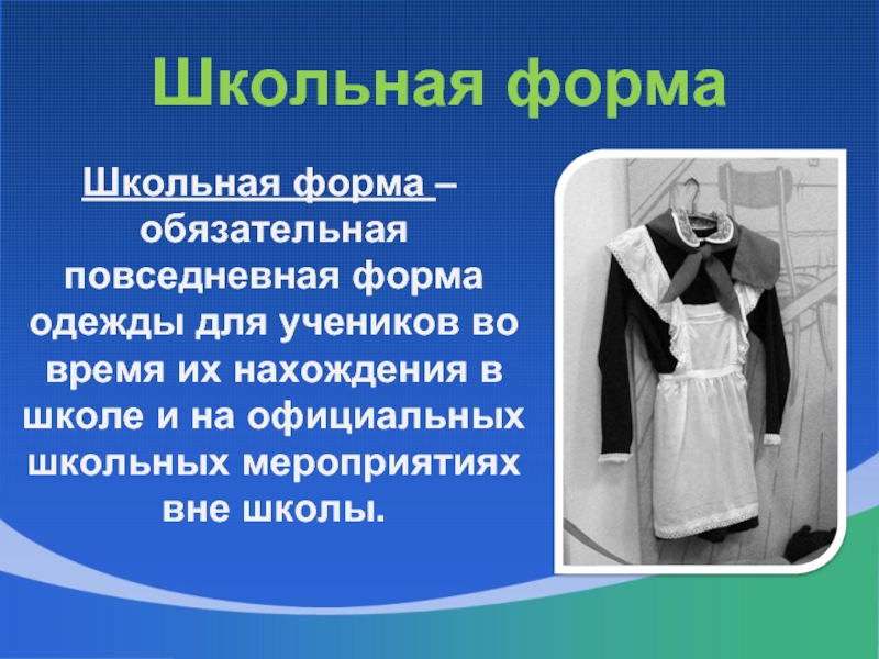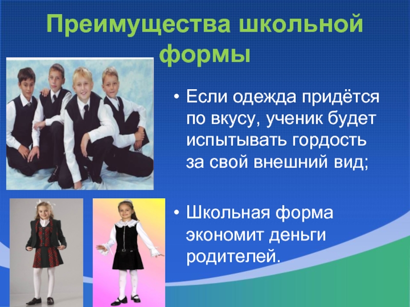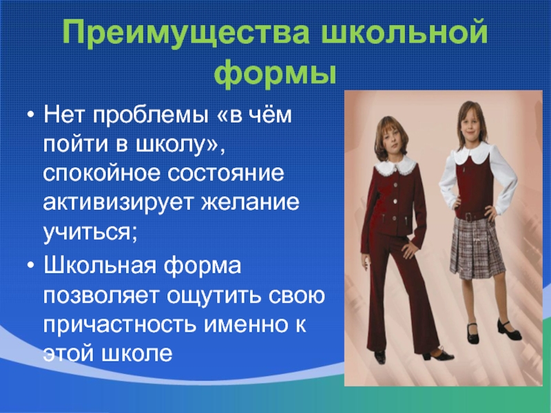 Слайд 27Школьная форма приучает к определенному порядку, дисциплине, сглаживает социальное неравенство, даёт