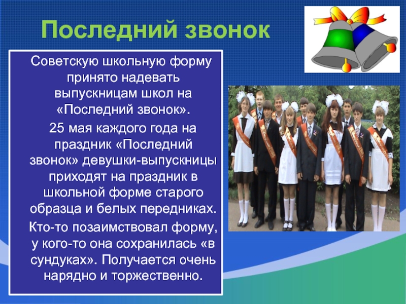 25 мая каждого года на праздник «Последний звонок» девушки-выпускницы приходят на праздник в школьной форме старого образца и белых передниках.