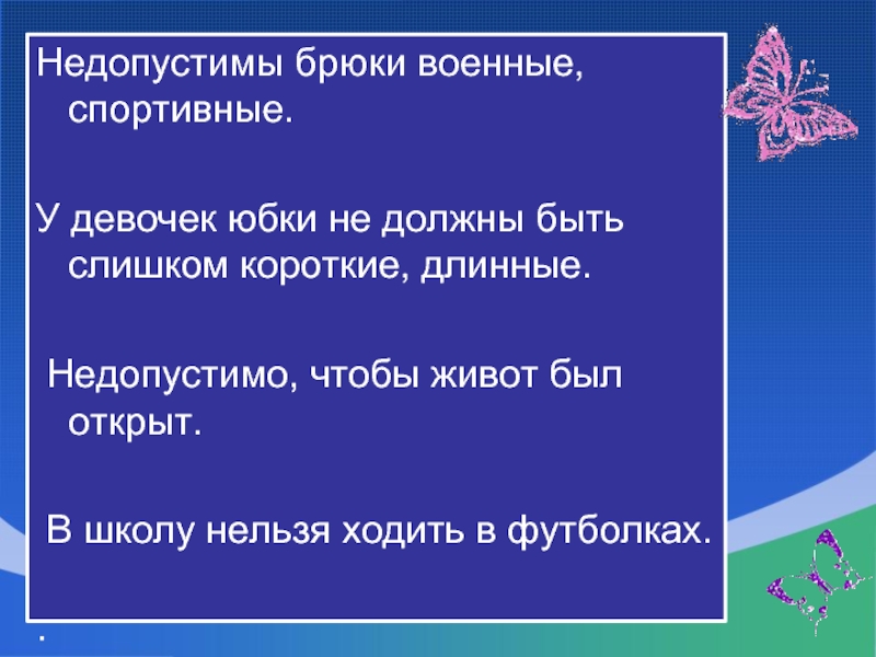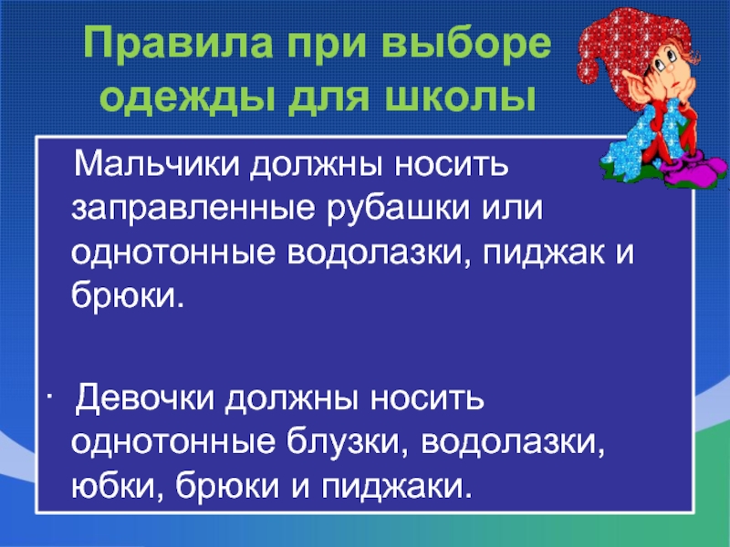 · Девочки должны носить однотонные блузки, водолазки, юбки, брюки и пиджаки.