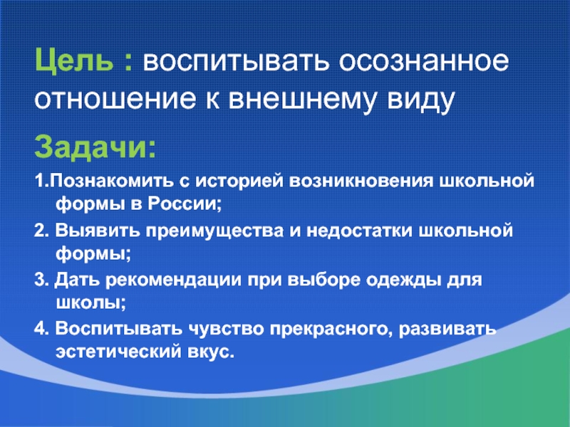 Слайд 2Цель : воспитывать осознанное отношение к внешнему виду